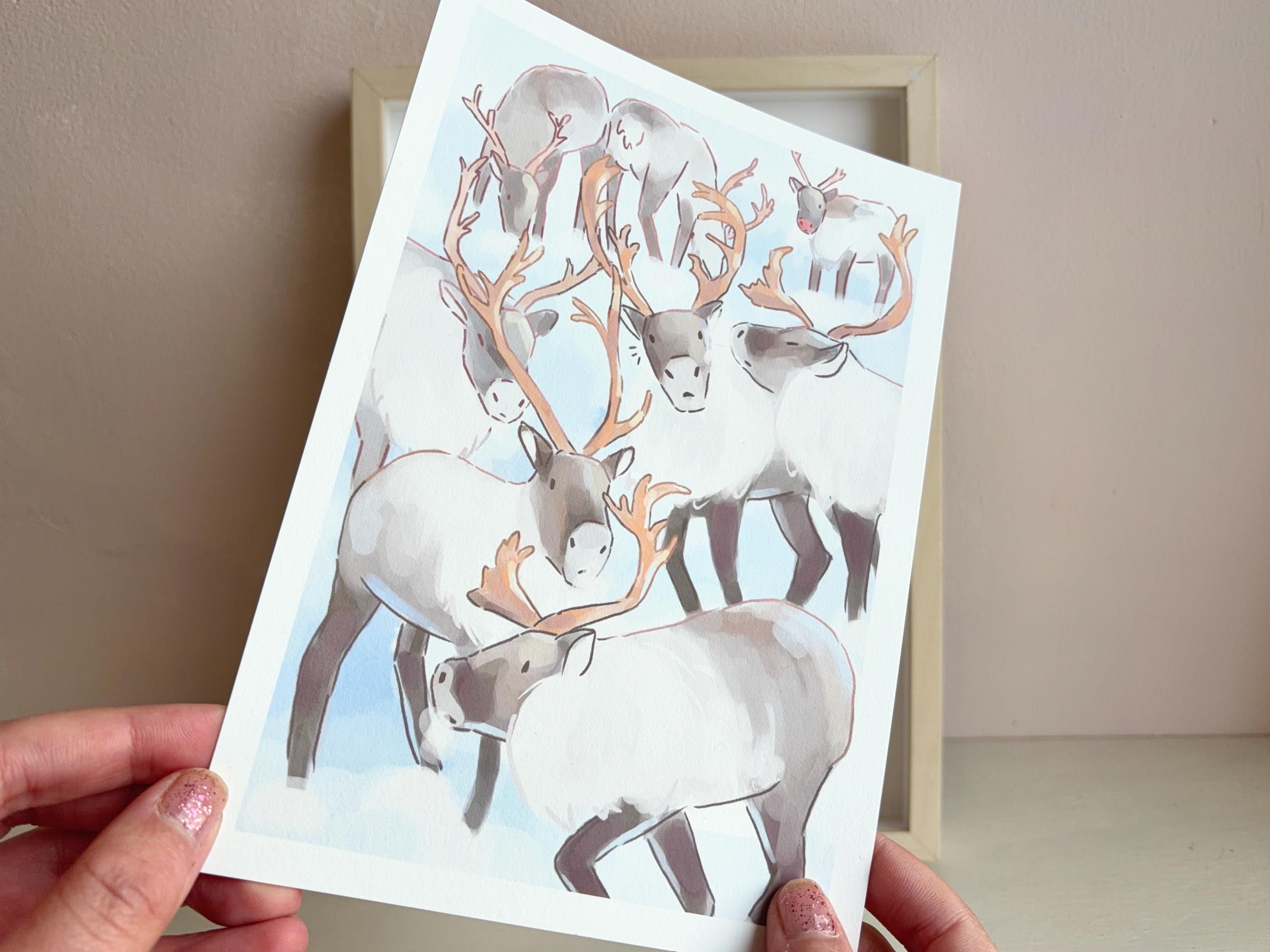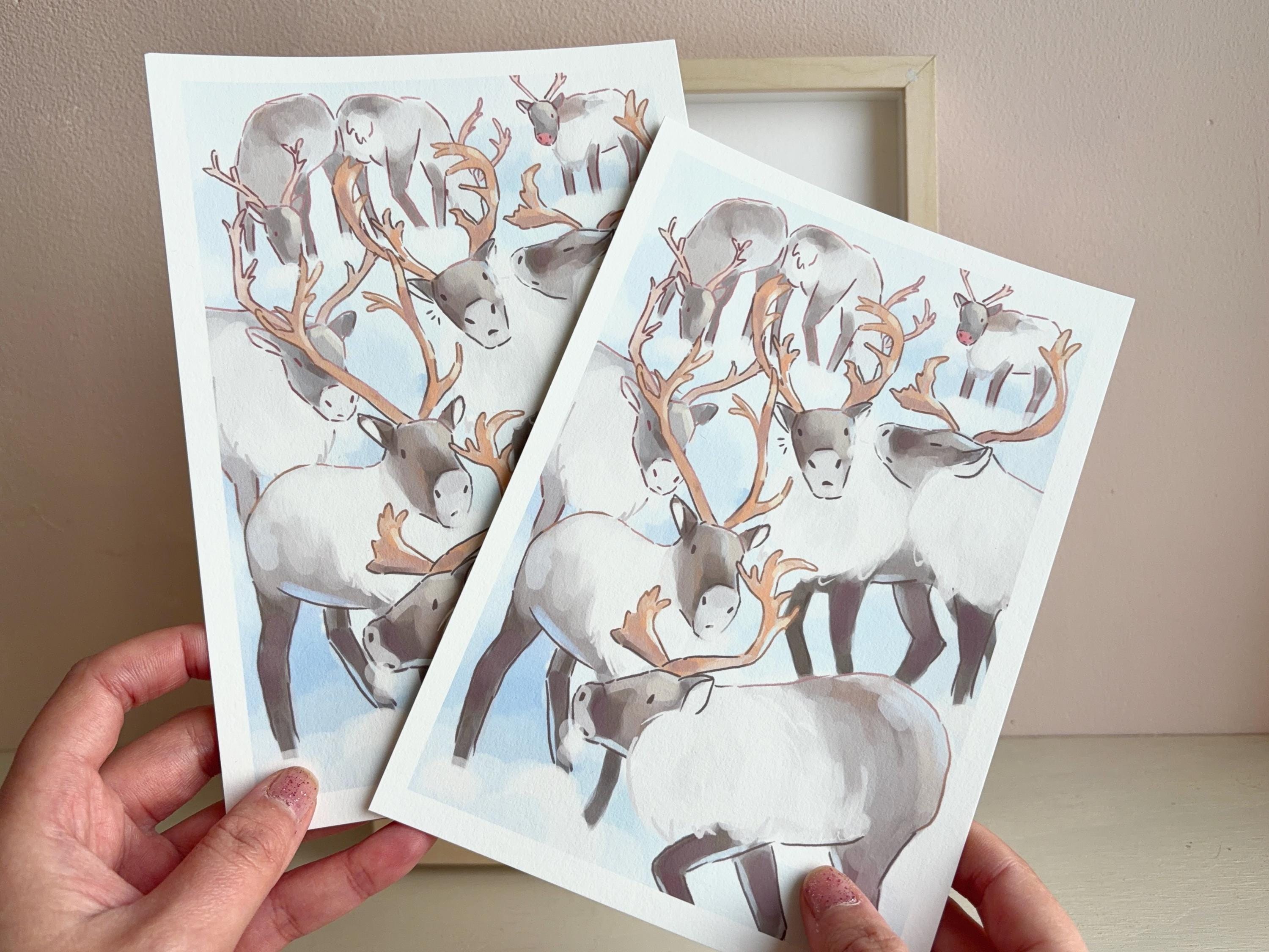 Reindeer Rudolf Print: Winter snow Hand Painted Illustration on Hemp Paper (A5/A4)